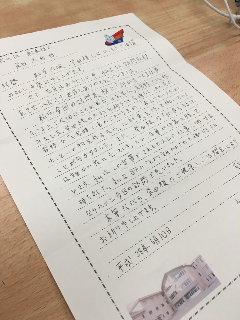 | 私は今回の訪問取材に「何かをつくる仕事をする上で大切なこと必要なことを学ぶ」を目標として臨みました。柴田社長のお話を伺うことを通して社員の皆様が「お客様に喜んでもらうため」「喜んでもらうためにもっといいものを作るため」に熱意を持って働いていることがわかりました。 また、柴田社長の「仕事をすることは誰かの役に立っている」という言葉が印象に残っています。私はこの言葉でこれまで以上に仕事に興味を持ちました。私は自分のことより誰かのために働ける人になりたいと今回の訪問で思いました。 |