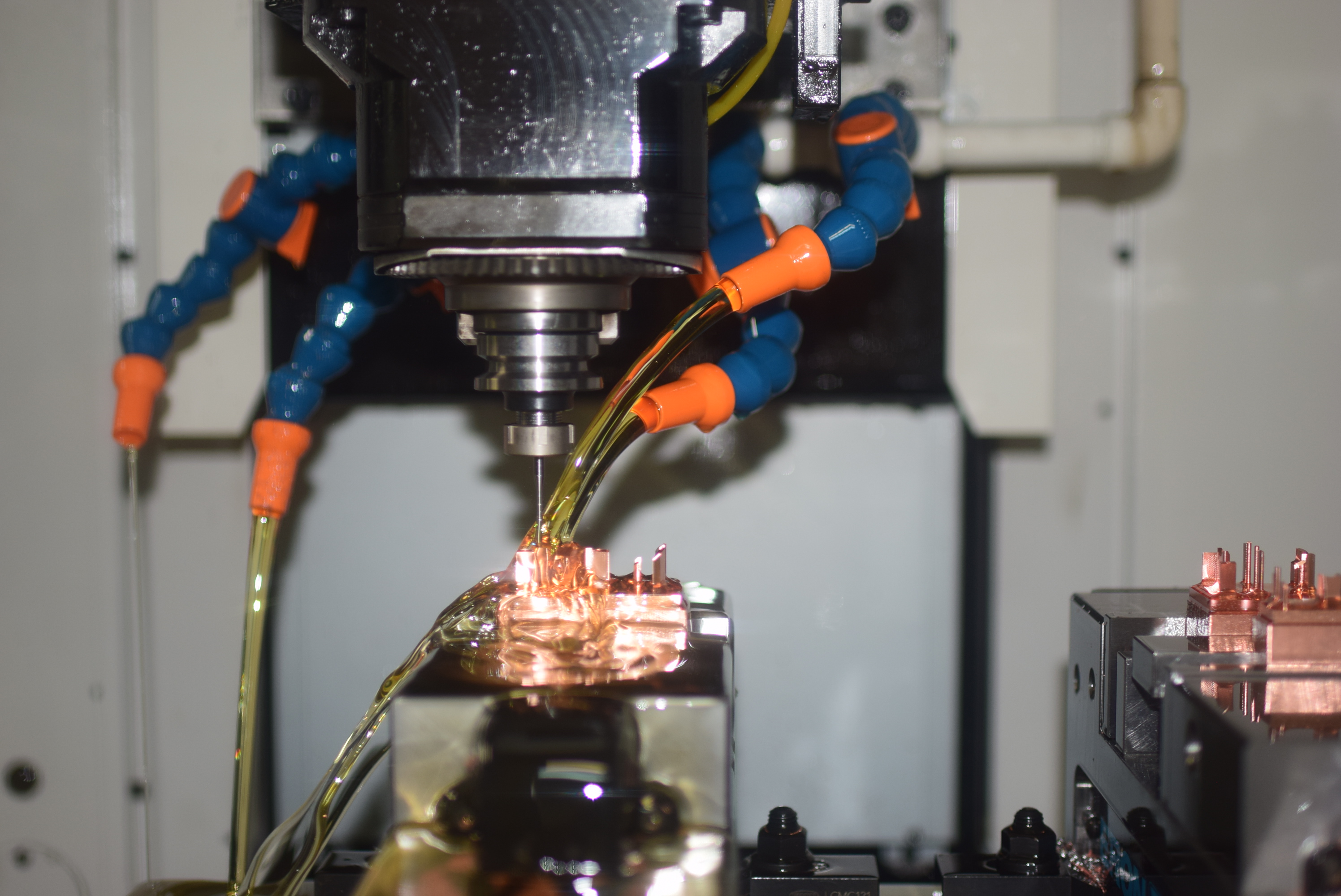 マシニングセンタの内部の様子。高温の油を流して切削加工することでプラモデルの金型を作っていきます。