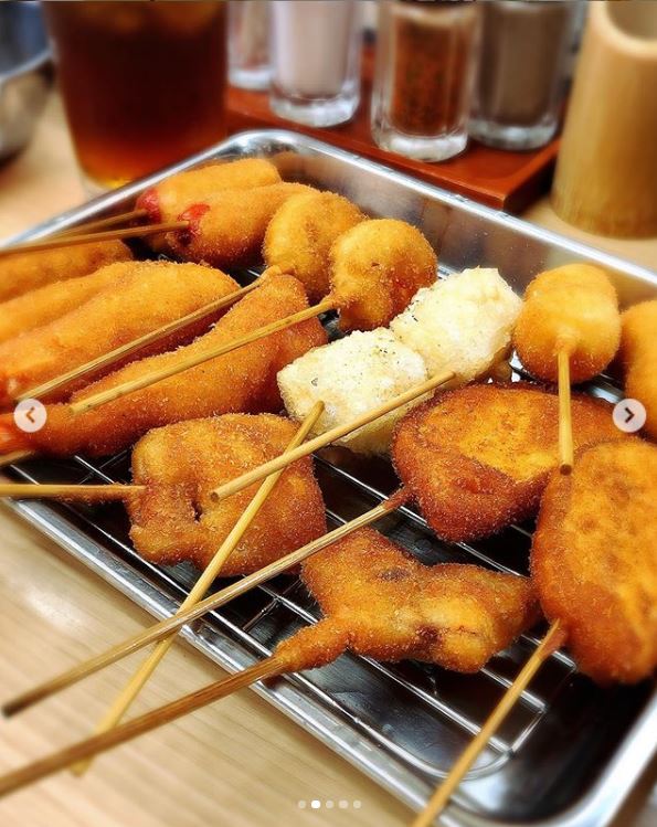 大阪では、社員の榑松 和弘(くれまつ かずひろ)と一緒に串焼きとたこ焼きを堪能しました。