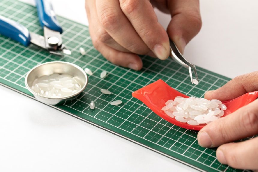 右にある白い物体、これはシャリです。一粒一粒、リアルな「コメ感」を再現した、まごうことなき「シャリたち」なんです。